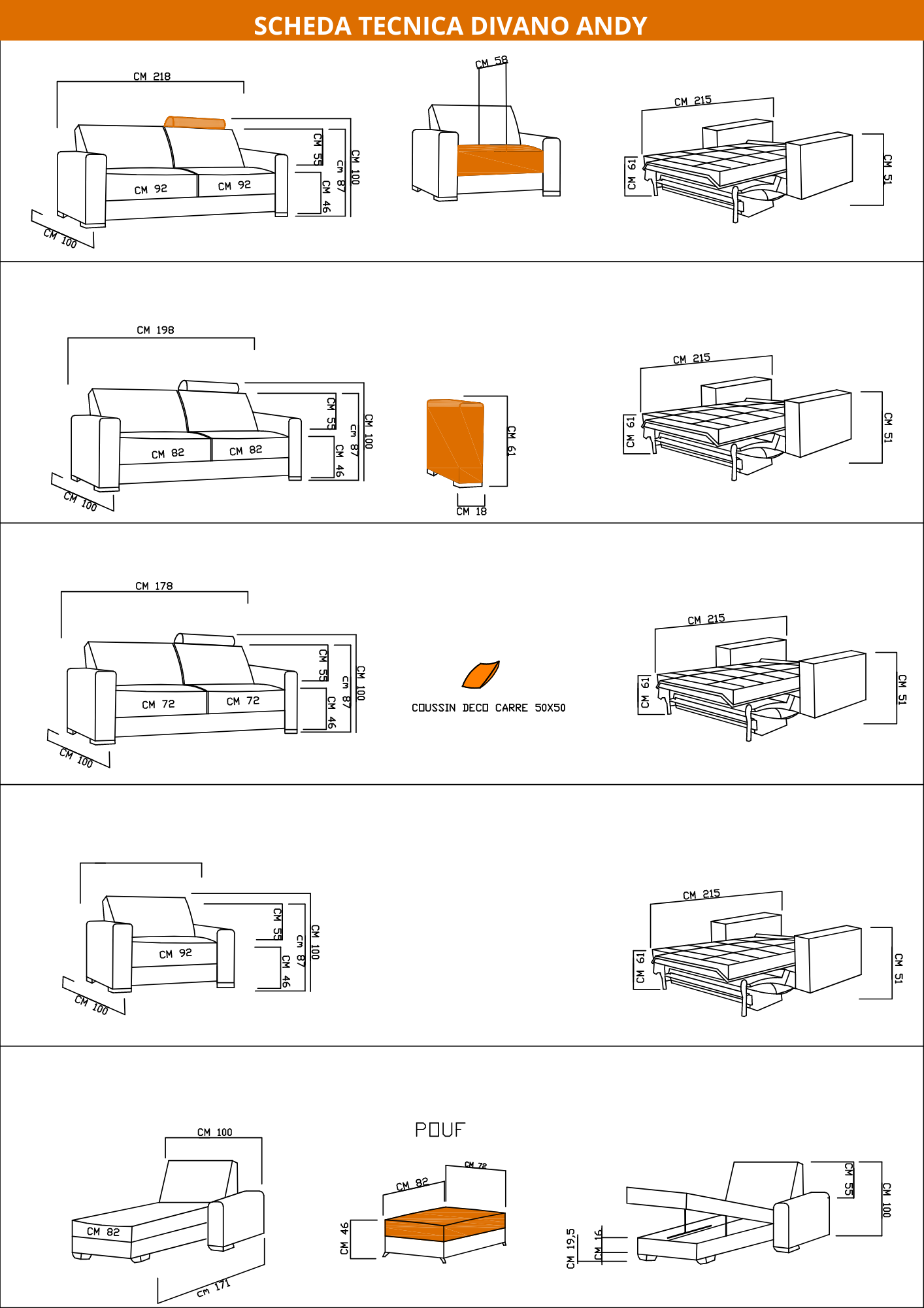 - Divano 2 posti: con materasso da 120×190 cm. L.156 cm-P.97cm chiuso/214cm aperto-H.95 cm
